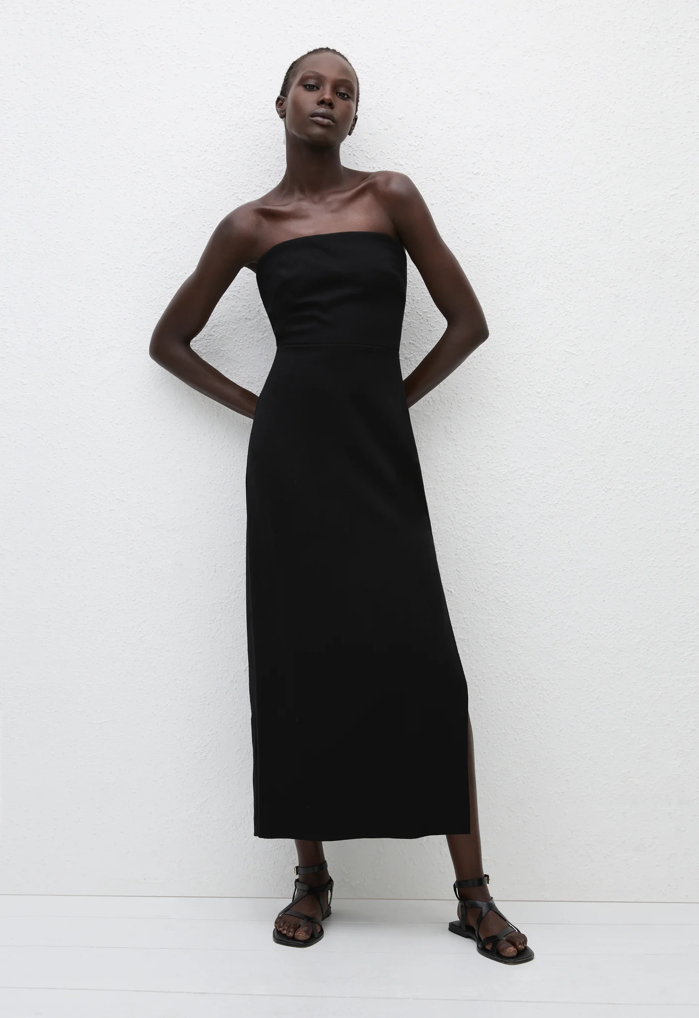 This flattering strapless midi dress is fitted through the bodice and high waist with a pencil fit skirt and side split for ease of wear. Crafted in our easy-wear lightweight wool blend, the lined bodice has bust darts with an internal elasticated channel at the neck edge and an invisible zip at the side seam for a comfortable and contoured fit. Perfectly elegant and understated, it's a wardrobe essential for summer event dressing.