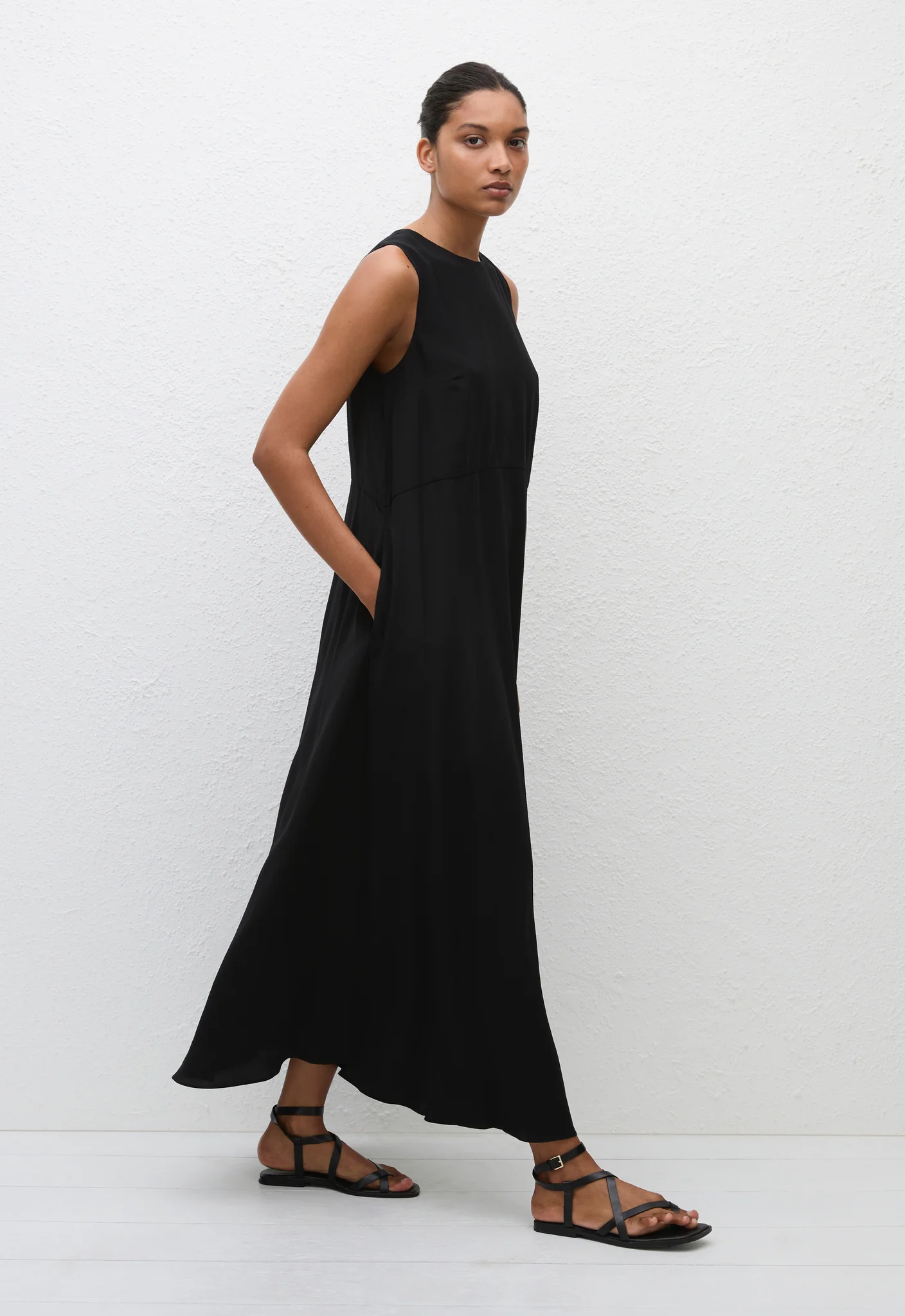 Crafted in our lightweight silk crepe de chine this sleeveless midi is refined and minimal with a flattering curved waist seam that flows into an elegant A-line skirt. This crew neck dress offers a discreet keyhole detail at the back of the neck, with a concealed button and loop fastening. The bodice is double layered and features bust darts to ensure both a flattering and comfortable fit.