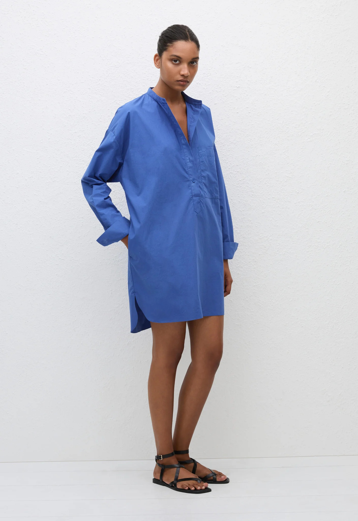 The Popover Mini Shirt Dress is a relaxed silhouette ideal for summer days. An easy pull-on style made from our organic cotton poplin with a washer finish, it features a collared crew neckline, button-down shirt detailing and an elevated centre-back inverted pleat feature. Style over your favourite swim for an easy daytime look.