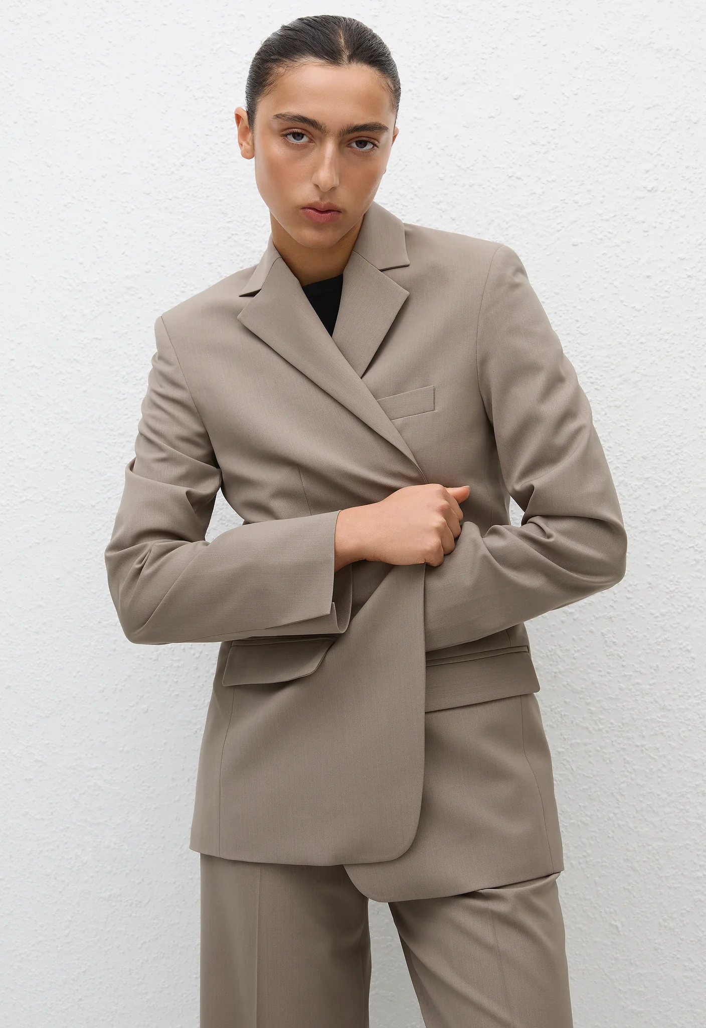 A menswear-inspired blazer, with a classic collar and two front pocket welts. Made from a lightweight wool blend and fully lined, this relaxed, tailored blazer is designed without buttons for a minimal look. Wear as a set with the matching Relaxed Tailored Trouser or Tailored Mini Skirt.