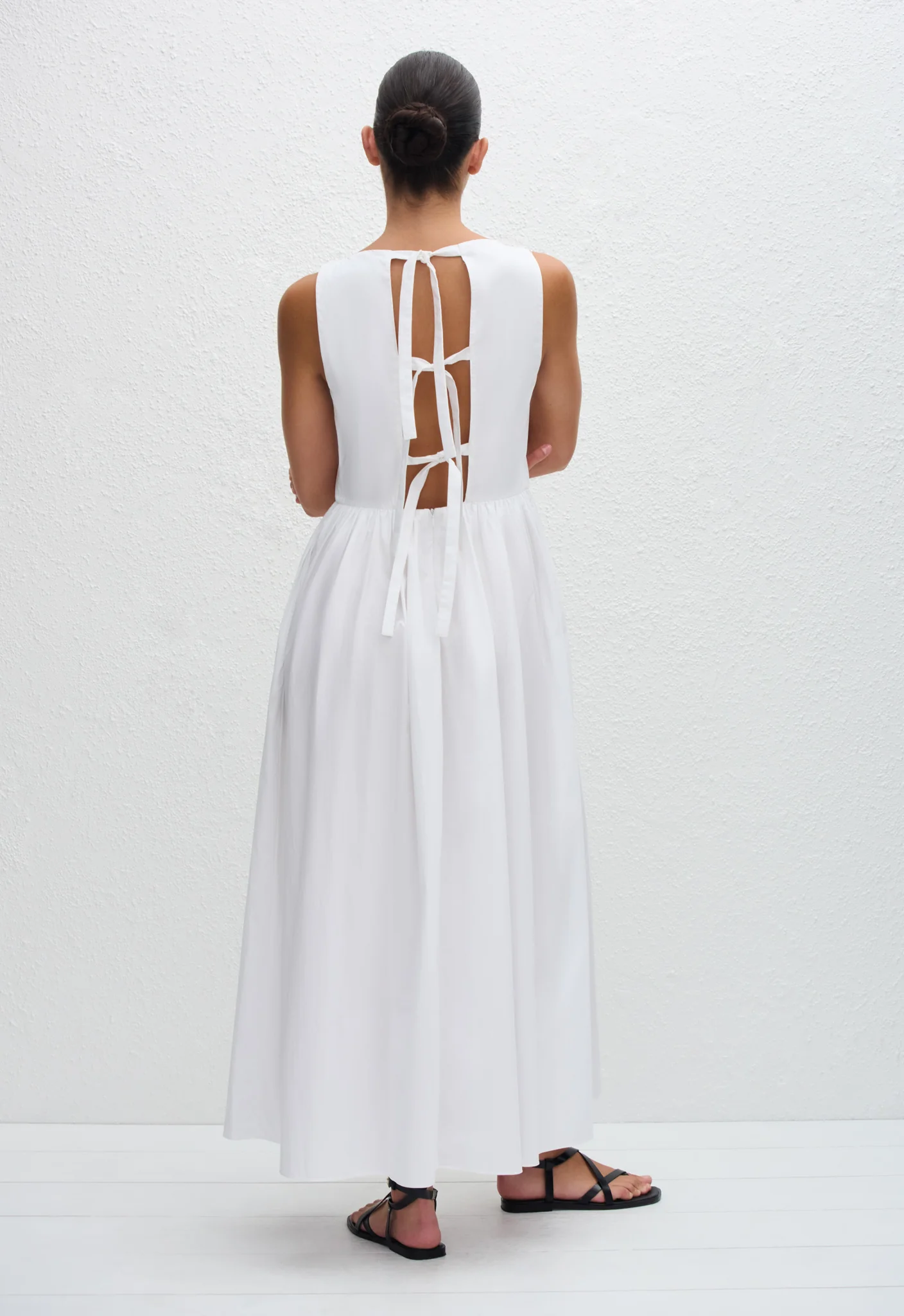 Our Tie Back Midi Dress, delivers the perfect blend of relaxed elegance. Featuring inseam pockets and an open back with bow ties for a delicate look and feel. Wear with strappy sandals for celebrations or long lunches under the sun.
