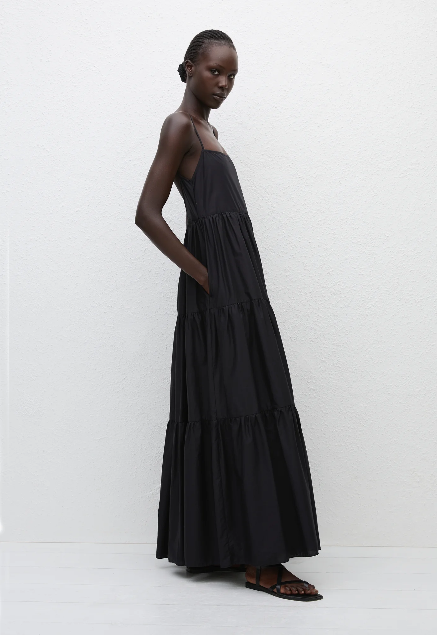 Elegant yet still relaxed, this dress is an elevated update to our classic Tiered Sundress. With delicate straps, functional side pockets, and a low scooped back, this organic cotton poplin dress is an essential for warm evenings after a day at the beach. Wear with strappy sandals for a refined, polished feel.